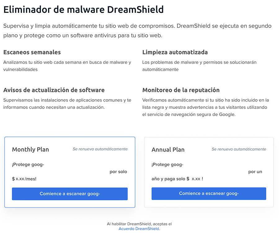 DreamHost, además, ofrece DreamShield, nuestro servicio interno de escaneo de malware. Al activar DreamShield en tu cuenta de alojamiento, escanearemos tu sitio cada semana, buscando código malicioso. Si vemos algo sospechoso, te notificaremos por correo.