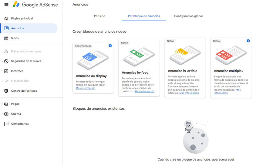 Para comenzar con este método, dirígete a tu cuenta de Google AdSense y haz clic en la pestaña ‘Anuncios’ en el menú a la izquierda. Luego, selecciona la opción ‘Por bloque de Anuncios’.