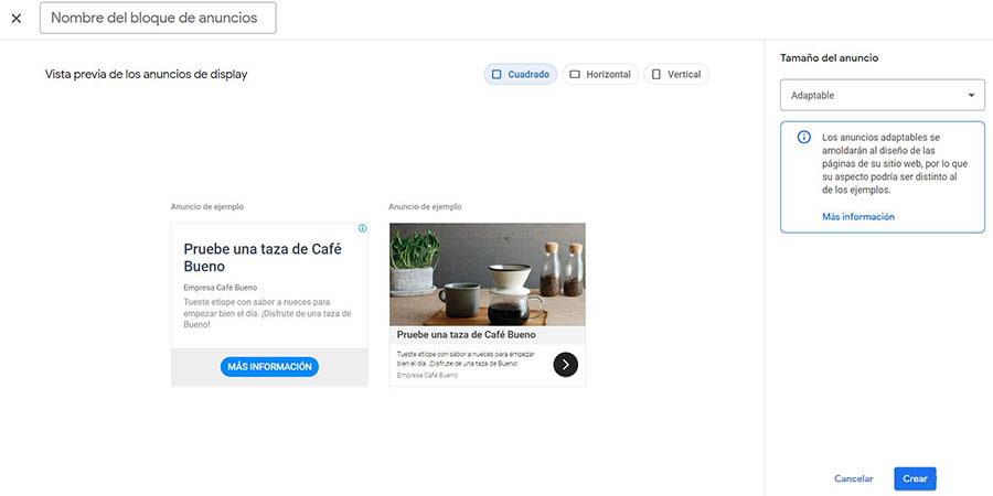Aquí, podrás seleccionar los tipos de anuncios, tal como display, in-feed o multiplex. Los anuncios ‘Display’ son los más comunes, ya que pueden ser ubicados en cualquier parte de tu sitio. Mientras tanto, los anuncios ‘in-feed’ se ubican en una lista de artículos o productos de tus páginas, los ‘in-article’ se muestran en tu contenido y los ‘multiplex’ se muestran en una cuadrícula.