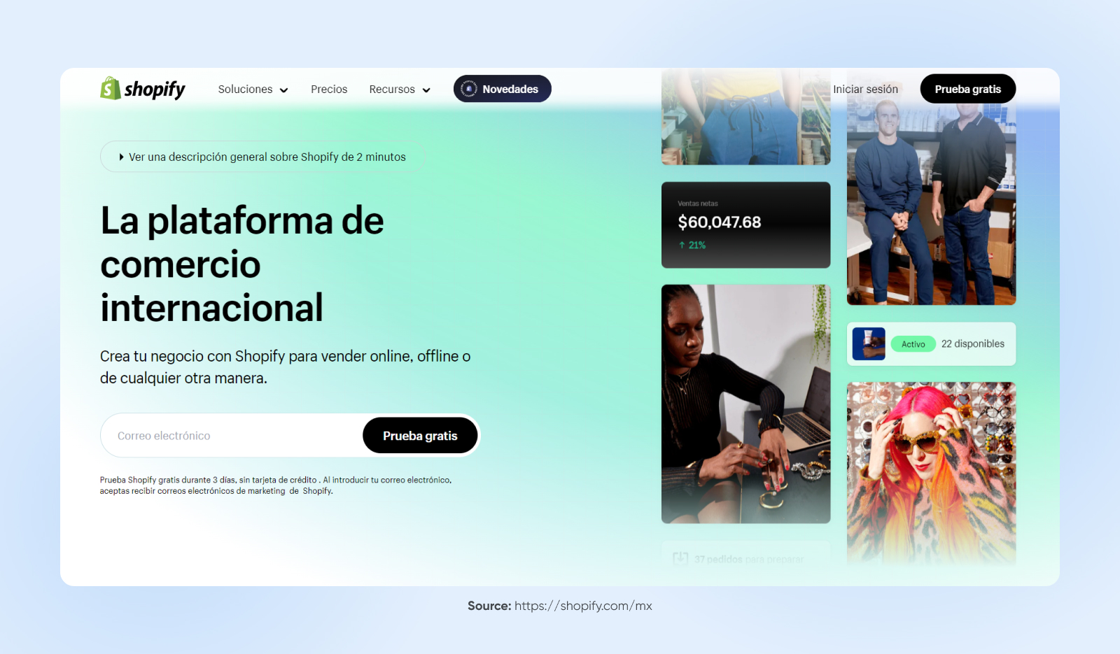 Shopify es una plataforma de comercio electrónico integral que contiene la mayor parte de lo que necesitarás para configurar una tienda en línea en un solo paquete simple. Es amigable para principiantes y te permite construir y personalizar tu tienda, enumerar tus productos y atraer clientes rápidamente.