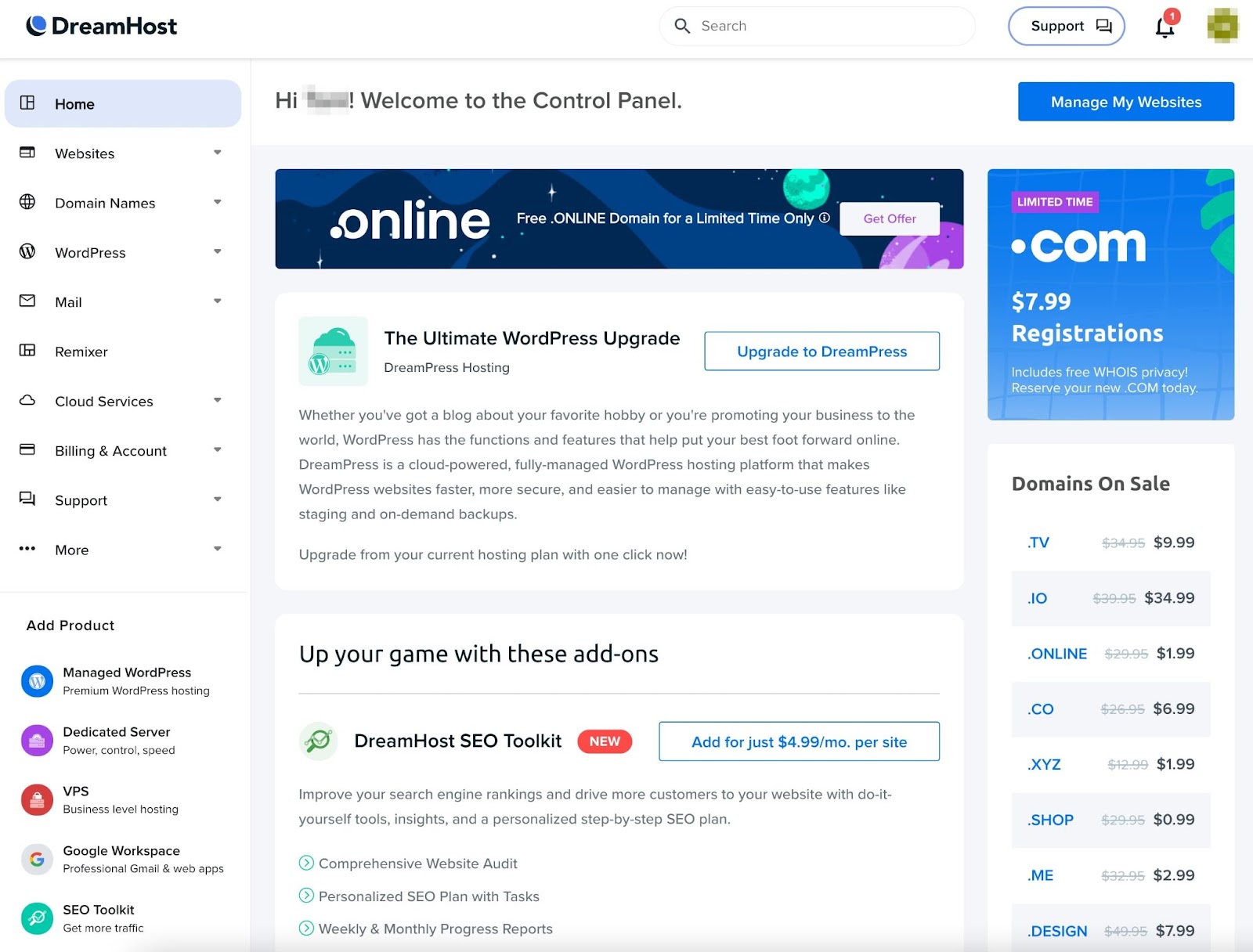 Выбор хоста, который предлагает пользовательскую панель управления может сэкономить вам много хлопот в долгосрочной перспективе. Панель DreamHost разработана так, чтобы быть удобной для пользователя, так что вы сможете легко найти информацию о вашем сайте, связаться с поддержкой или редактировать информацию вашего аккаунта: