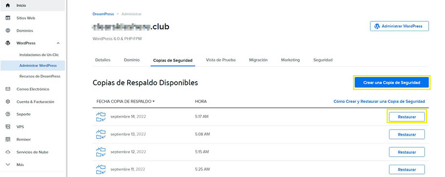 Para acceder a tus copias de seguridad como cliente de DreamPress, inicia sesión en tu cuenta y selecciona la opción ‘DreamPress’ en el menú de barra lateral. Desde ahí, encuentra el dominio que deseas respaldar y haz clic en el botón ‘Administrar’. Luego puedes seleccionar la pestaña ‘Copias de Seguridad’ donde todas tus copias estarán enumeradas y también puedes crear una nueva o restaurarlas con un solo clic.