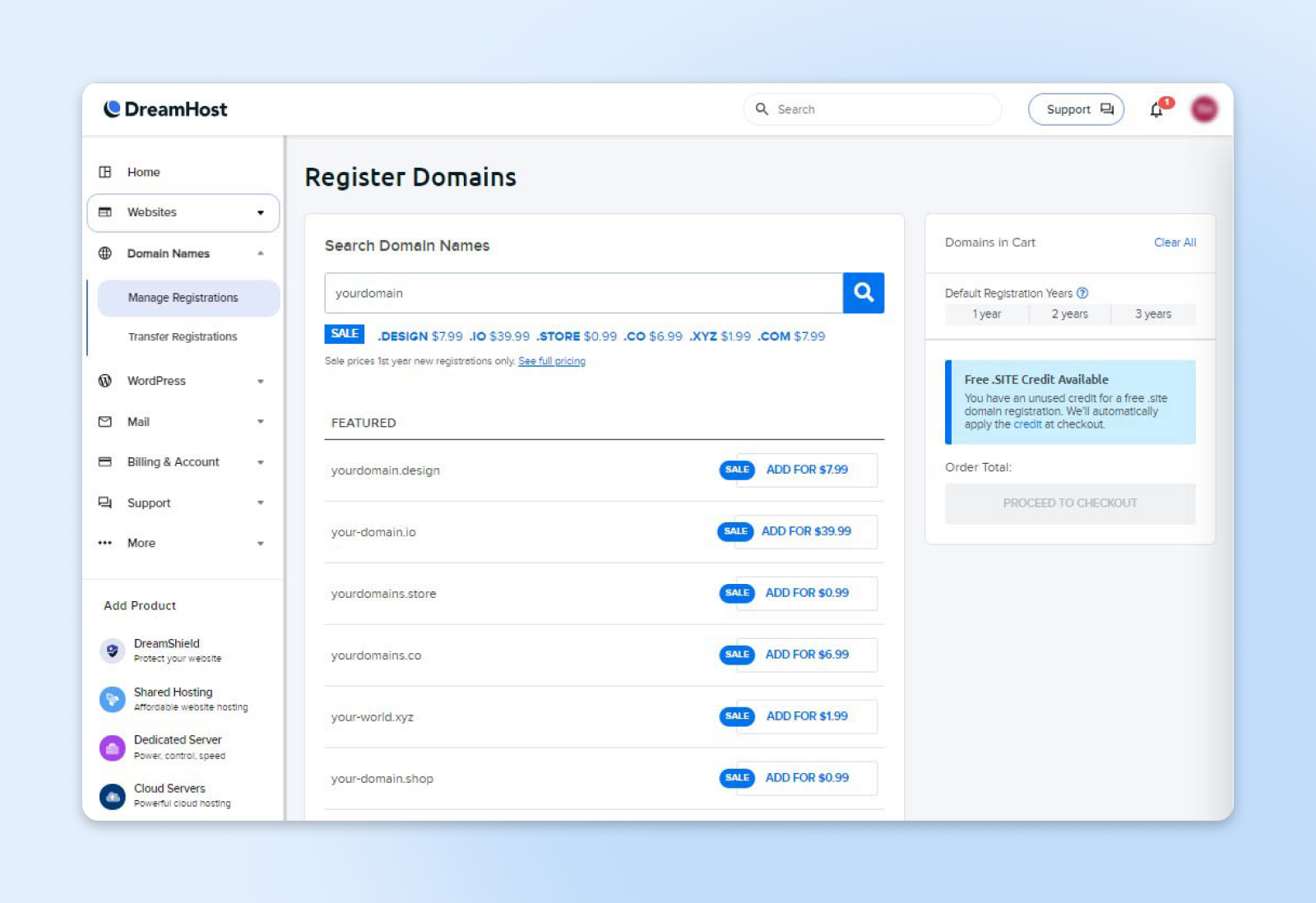 Los planes de Alojamiento Compartido de DreamHost, hacemos que controlar tu sitio sea más fácil. A través de tu panel, verás todo lo relacionado con tus sitios web, dominios y cuenta, en un solo tablero.