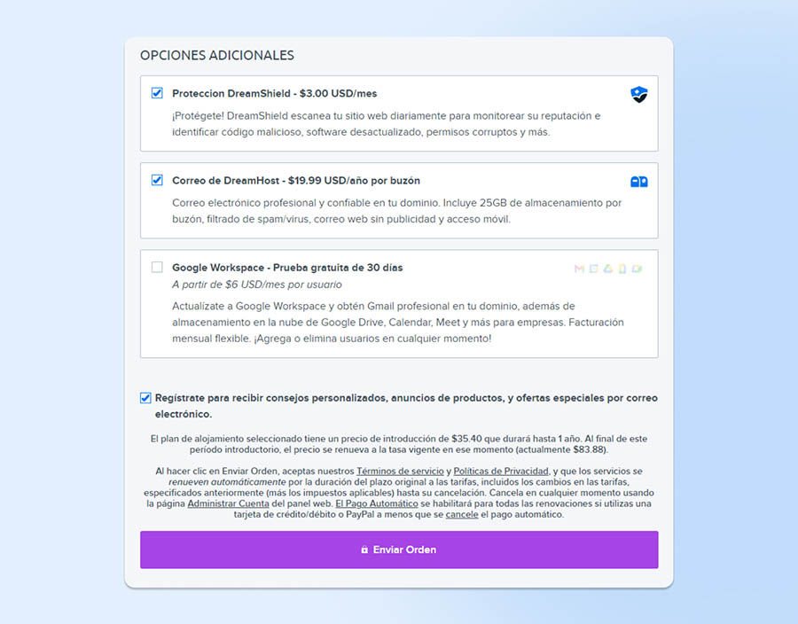 La creación de la cuenta de DreamHost está en la tercera página (Pago seguro). Debajo, hay opciones adicionales que puedes configurar, para tu nuevo sitio.