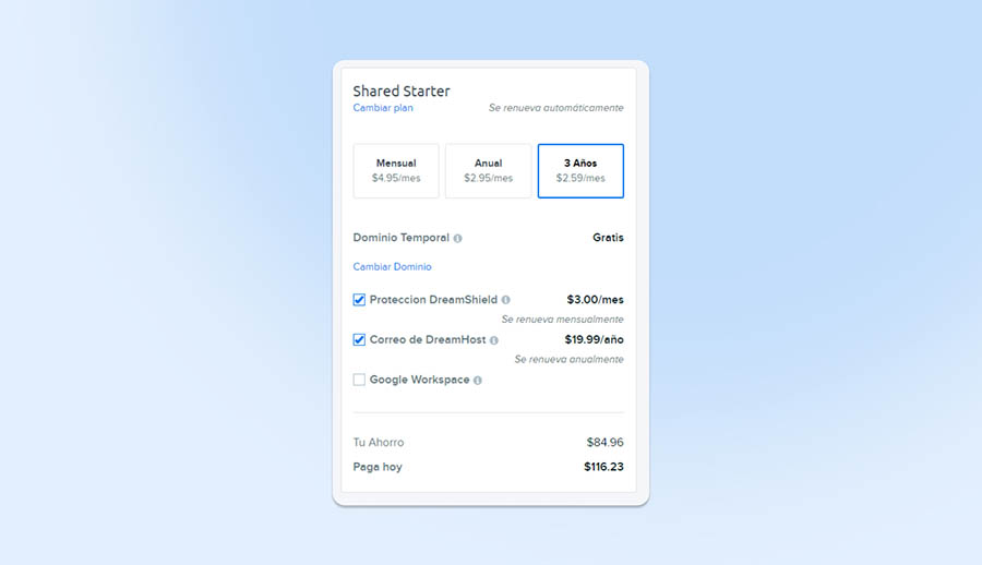 En DreamHost, tenemos planes interesantes de alojamiento compartido desde $2.59 USD mensuales; incluyen el registro gratuito de 1 dominio.